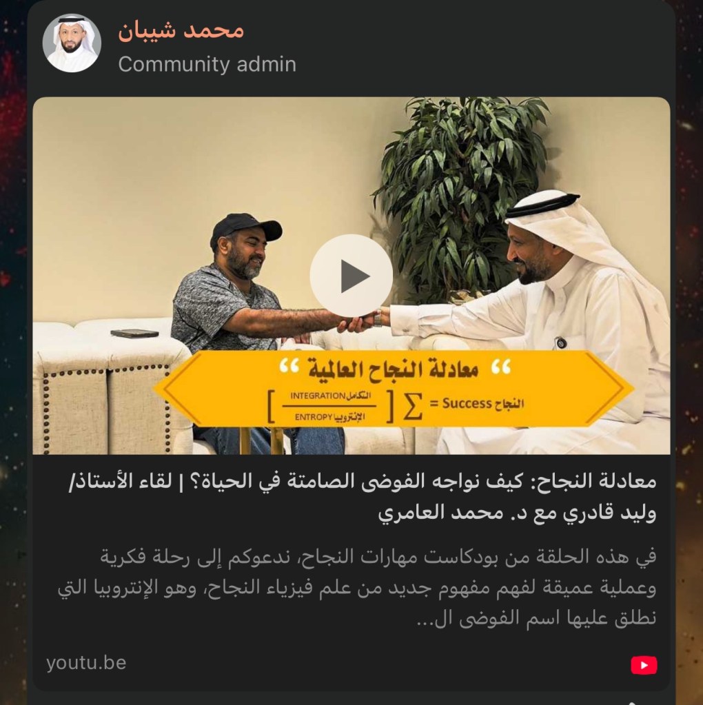 📢 بودكاست جديد وحوار ملهم 🎙️ معادلة النجاح: كيف نواجه الفوضى الصامتة في الحياة⁉️ 🗣 لقاء ثري بين الكاتب والقاص والقائد والمدرب الأستاذ وليد قادري و د. محمد العامري 🔥حول معادلة عبقرية: النجاح = مجموع (التكامل ÷ الإنتروبيا)