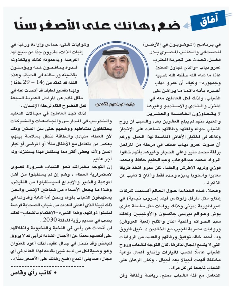 إن التوجه بخبراتك نحو الشباب ضرورة قصوى لاستمرارية العطاء ، وهم إن لم يستقبلوا من أهل الموهبة والخير والإبداع فسيستقبلون من النقيض، وهذا ما يجعل الأعداء من شياطين الإنس والجن يستهدفون الشباب بقوة، ونحن أمة شابة وقدوتنا في ذلك نبينا ﷺ الذي أعطى للعديد من شباب الصحابة فرصة ليثبتوا ذواتهم، وهذا الشيء -الاهتمام بالشباب- كذلك يصب في صميم رؤية المملكة 2030..